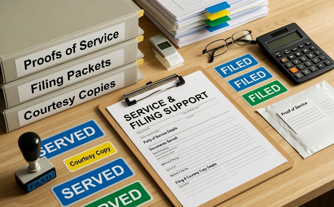 Service & Filing-Ready OrganizationGetting paperwork “file-ready” often means more than just typing forms. We help assemble complete sets with consistent captions, proper attachments, labeled exhibits, and practical organization—so you can file and serve your documents with fewer surprises. Common support tasks include: